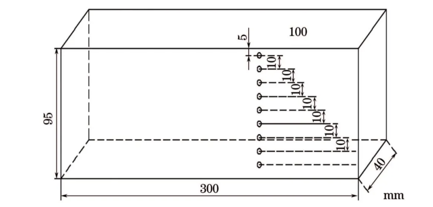 試驗(yàn)采用的試塊結(jié)構(gòu)示意見(jiàn)圖7,脈沖反射法超聲測(cè)試采用普通數(shù)字超聲儀,配頻率為2.5MHz、晶片面積為13mm×13mm、折射角為45°的橫波探頭;全聚焦相控陣測(cè)試采用CTS-PA22T型儀器,配頻率為2.5MHz,面陣8×8-陣元3×3(等效孔徑為24mm×24mm),折射角為55°的橫波探頭。由于測(cè)量的是各自聲場(chǎng)中不同位置的聲壓變化,兩種探頭晶片面積不同并不影響測(cè)量的準(zhǔn)確性。